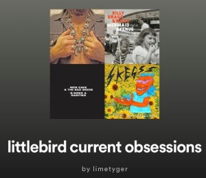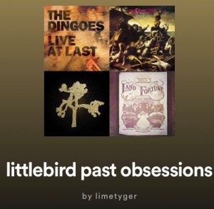 Anyway, if you want to know what songs I’m listening to on repeat – littlebird current obsessions playlist has my current faves which I’ll be culling come Jan 31! Never fear though, all songs end up on littlebird past obsessions, so you can still have a listen there…beware it’s a very lonnnng list! You can follow me on Spotify find my public playlists (and some of my kids – eek!) at limetyger. All of my playlists are prefixed ‘littlebird’.